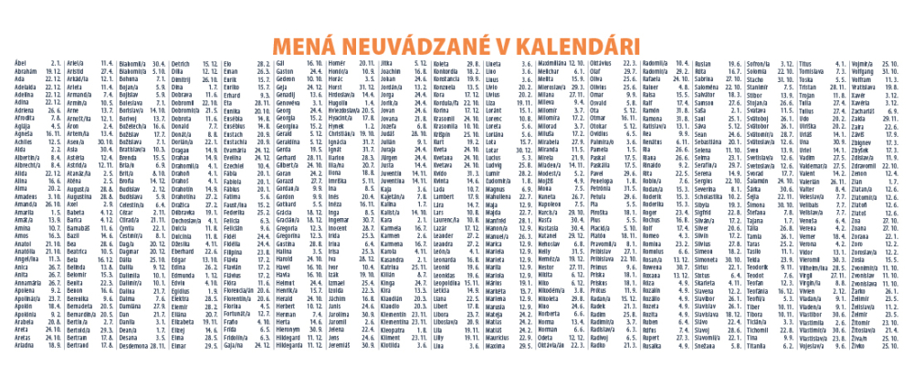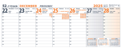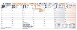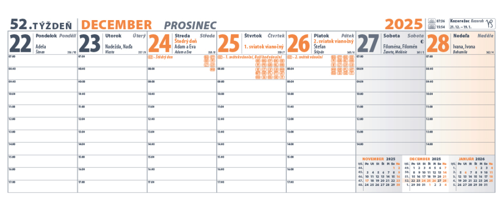 Najpredávanejší stolový kalendár, veľmi prehľadný, vhodný pre aktívnych ľudí. Obsahuje dostatočný priestor na poznámky a všetky potrebné informácie pre každý pracovný deň. Týždňový stĺpcový kalendár s hodinovým delením, daňovými pripomienkami, mesačnými kalendáriami, fázami Mesiaca, východmi, západmi Slnka, štátnymi sviatkami krajín EÚ, školskými prázdninami, znameniami zverokruhu, slovenskými a českými menami (plus netradičné mená).