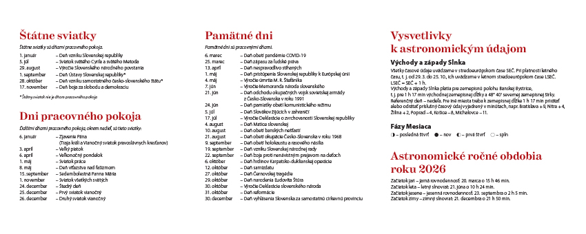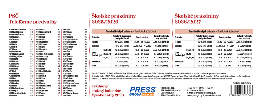 Tatranské štíty, príroda a ľudia, zachytené v stolovom týždňovom kalendári s riadkovým delením, daňovými pripomienkami, fázami Mesiaca, východmi a západmi Slnka, štátnymi sviatkami všetkých krajín EÚ, školskými prázdninami, slovenskými a českými menami (plus netradičné mená).